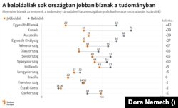 Jó pár országban nincs érdemi különbség. Csehországban pedig pont fordítva van, ott a jobboldaliak bíznak lényegesen jobban a tudomány pozitív társadalmi hatásaiban.