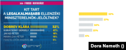 Lukoczki Károly kicsi előnye szinte behozhatatlannak tűnik az ábra alapján, miközben az sem egyértelmű, hogy mit mutatnak a százalékok. Ha ez a DK szavazóinak igen-nem típusú bizalmát mutatja, akkor a többségük nem bízott Lukoczki Károlyban. Ennél az ábránál megmutatjuk a valós méretarányt a jobb oldalon, de a későbbi, látványosan torzító ábráknál esetenként csak jelezzük majd.