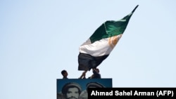 Pandzsír tartomány zászlóját lengeti két harcos Ahmad Sah Maszúd portréja fölött.