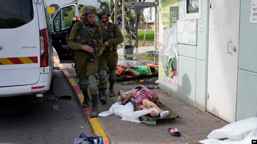 Izraeli katonák a palesztin fegyveresek által kivégzett civilek holttestei mellett az izraeli Szderótban 2023. október 7-én