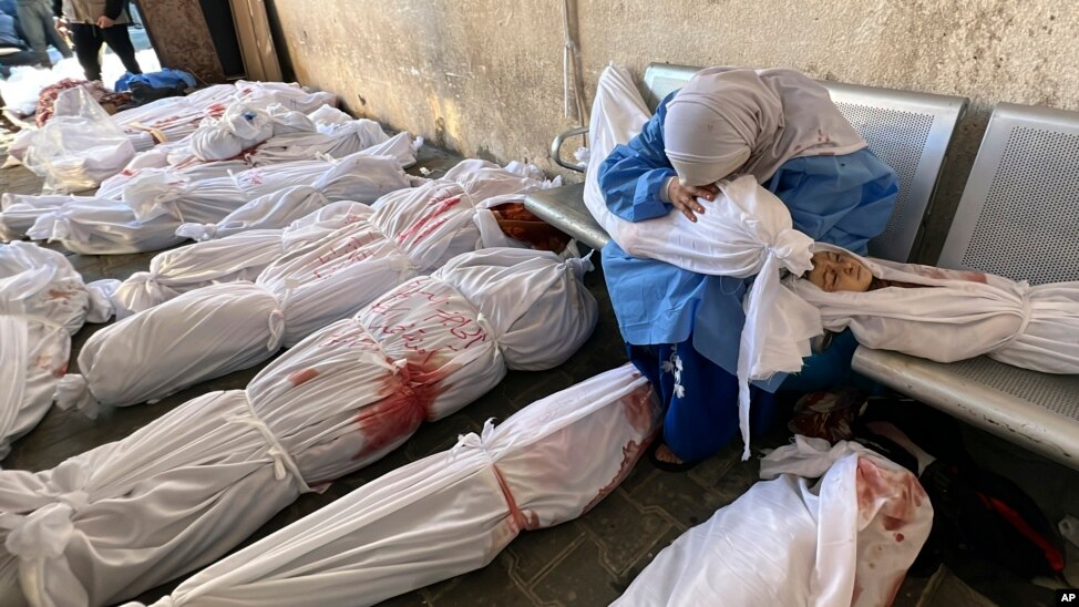 Egy palesztin nő gyermeke holttestét fogja egy kórházban a Gázai övezet északi részén 2023. november 18-án. A képen látható áldozatok a Dzsabalíja menekülttábor elleni izraeli légicsapásban megölt palesztinok