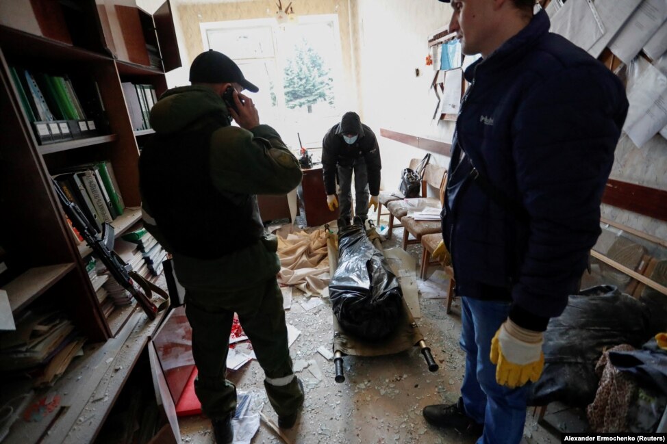 Egy iskolai alkalmazott holttestét készülnek elszállítani, aki Horlivka támadása közben vesztette életét február 25-én