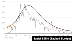 Az ábrán az látszik, hogy a halálozások tekintetében még csak most várható a járvány legsúlyosabb hónapja. A 4-500 fős halálozás önmagában csak egy számnak tűnhet, de ilyenkor egy hosszú hétvége alatt meghalna egy falunyi ember.
