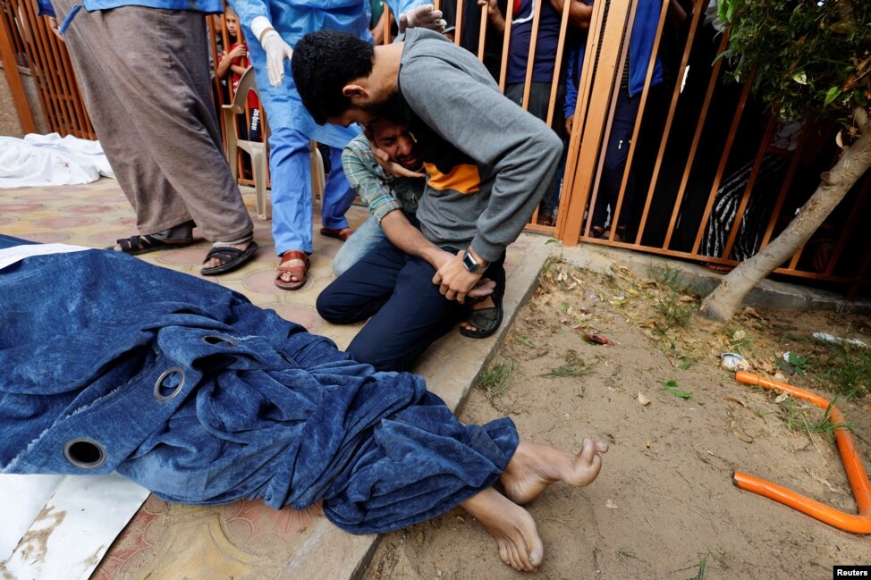 Hozzátartozók az izraeli csapásokban megölt palesztinok holttestei mellett a Gázai övezet déli részén, egy kórház udvarán 2023. október 17-én. Azt követően került sor az evakuálásra, hogy Izrael teljes ostromot rendelt el a Gázai övezetben, válaszul a Hamász egy héttel ezelőtt indított brutális támadására, amelynek legalább ezernégyszáz halottja volt Izraelben