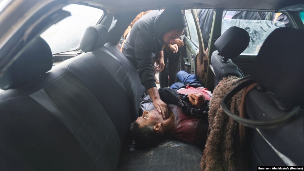 Hán Júnisz központi kórházába minden lehetséges eszközzel -mentőautóval, személygépkocsival, platós teherautóval- sebesülteket szállítottak, miután a túlélők szerint egy iskolát ért csapás. Az épület civilek menedékhelyéül szolgált. A képen egy sebesült palesztin férfi fekszik egy autóban, miközben a Nasszer kórházba viszik, 2023. december 5-én