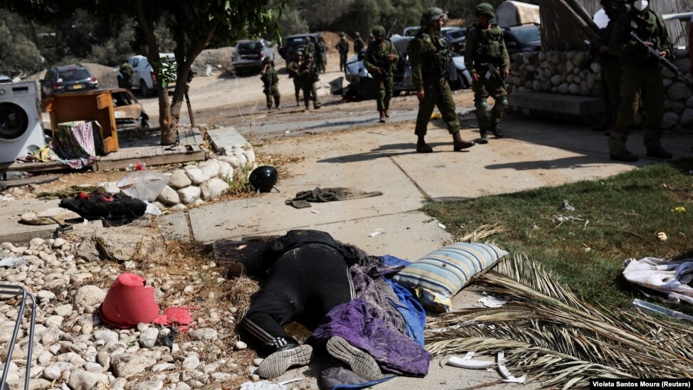 Egy férfi holtteste fekszik a törmelék között a gázai fegyveresek támadása után a dél-izraeli Kfar Aza kibucban 2023. október 10-én. A Hamász meglepetésszerű légi és szárazföldi támadást indított Gázából október 7-én, szombat kora reggel. A fegyveresek halálos rakétatüzet lőttek ki és fegyvereseket küldtek a dél-izraeli területre