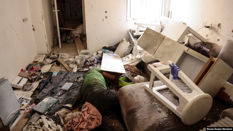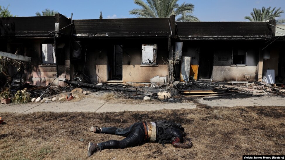 Egy civil holtteste fekszik a szétzúzott otthonok mellett a Hamász támadása után Kfar Aza kibucban. A településen házakat fosztottak ki és gyújtottak fel a Hamász terroristái. Összetört személyes tárgyak, fel nem robbant gránátok és holttestek látványa fogadta a helyszínre érkező izraeli csapatokat