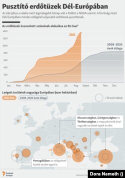 És aztán infografikán is megmutattuk, mekkora területeket érintett idén nyáron az erdőtűz Dél-Európában is: