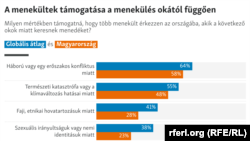 Globálisan négyből három ember szerint a háború elől menekülőket be kell fogadnia egy másik országnak. Az elmúlt három évben folyamatosan és jelentősen erősödött az ezt támogatók aránya Magyarországon is. Ezzel párhuzamosan a magyar többség károsnak gondolja őket a befogadó ország szempontjából. A magyarok kiugróan elutasítók például azokkal, akiket a vallásuk miatt üldöznek.