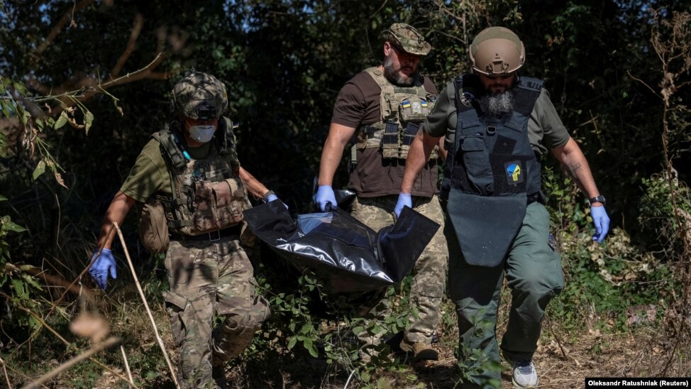 Ukrán önkéntesek egy orosz katona holttestét viszik a délkelet-ukrajnai Blahodatne faluban szeptember 8-án. Három hónappal a falu felszabadításáért vívott harc után a területet elég biztonságosnak ítélték ahhoz, hogy az önkéntesek megkezdhessék a holttestek kiemelését. A faluba vezető utat a halál útjának nevezték el a megölt orosz katonák száma miatt