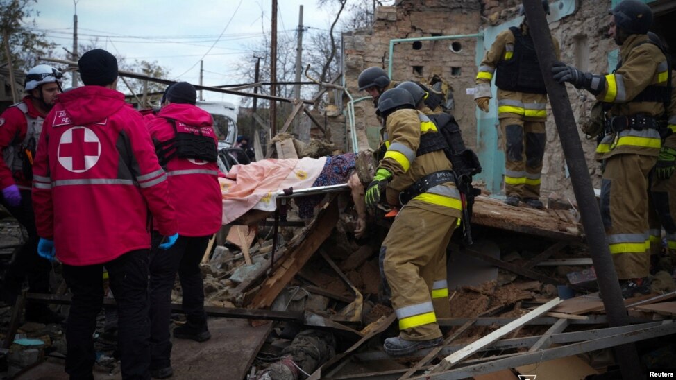 Egy nő holttestét viszik el, akit egy orosz dróncsapás ölt meg mikolajivi házában 2024. november 17-én. A déli Mikolajivban két ember halt meg az éjszakai dróntámadásban. A Dnyipropetrovszki területen egy vasúti raktár ellen intézett támadásnak két halálos áldozata van. A Lengyelországgal határos Lvivi területen egy, az Odesszai területen további két ember vesztette életét a támadásokban