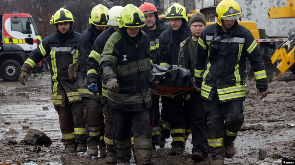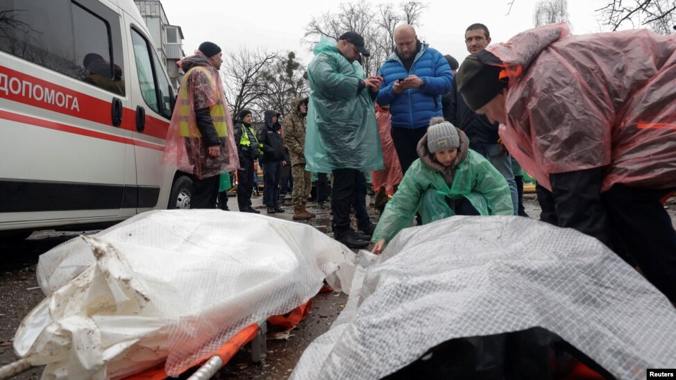 A romok alatt talált holttestek az ukrajnai Poltavában 2025. február 1-jén. A támadásban legalább tizennégyen vesztették életüket, köztük két gyermek