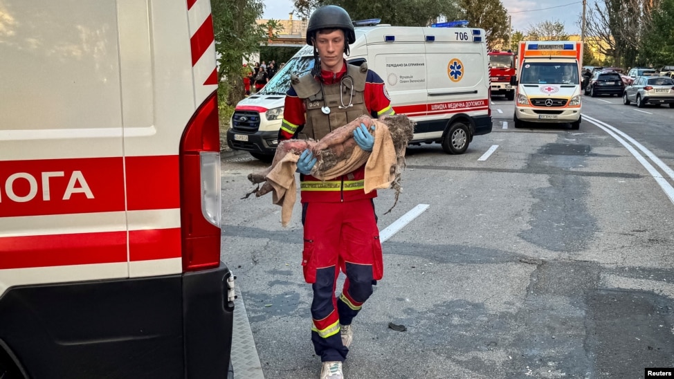 Harkiv, amely Ukrajna északkeleti részén, az orosz határ közelében fekszik, a háború kezdete óta rendszeresen orosz drón- és rakétatámadások célpontja. Egy mentős, karjában egy gyermekkel az orosz dróncsapás után, augusztus 18-án