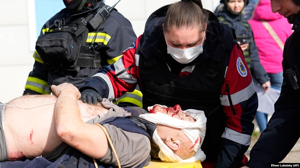 A szerdai orosz rakétatámadás egyik sebesültje. A harkivi katonai közigazgatás vezetője, Oleh Szinyehubov azt írta Telegramon, hogy a romok alatt rekedhettek emberek