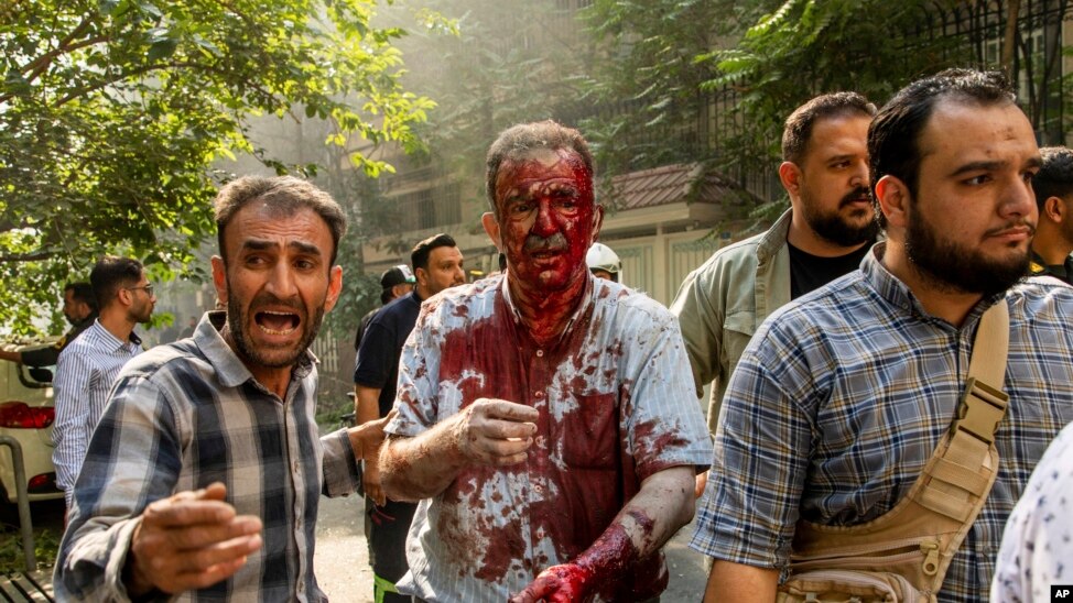 Marco Rubio amerikai külügyminiszter azt mondta, Izrael „egyoldalú intézkedéseket hozott Irán ellen”, és az Egyesült Államok -bár a Trump-kabinet tudott az izraeli tervről- ebben semmilyen formában nem vett részt. A fotón egy sebesült férfi a Teheránt ért egyik légitámadás után, június 15-én
