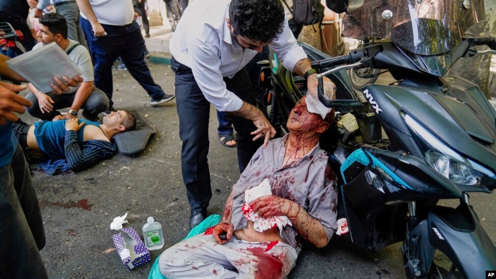 Sebesülteket látnak el Teherán utcáin a június 15-ei izraeli rakétatámadás után