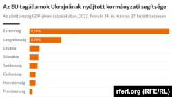 Ha az országok támogatását a saját gazdasági lehetőségeikhez mérjük, akkor Észtország messze kiugróan igyekezett támogatni Ukrajnát. Csaknem a GDP-jük 0,8 százalékát adták oda az ukránoknak egy hónap alatt, egyébként kizárólag hadianyagban és orvosi eszközökben. Ez a magyar GDP-hez mérve azzal lett volna egyenértékű,